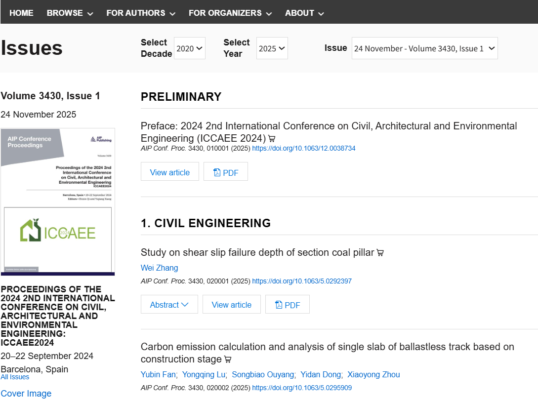 2024 2nd International Conference on Civil, Architectural and Environmental Engineering (ICCAEE 2024) has been published by "AIP Conference Proceedings" (Online ISSN 1551-7616, Volume 3430, Issue 1) and indexed by Scopus and other major databases.